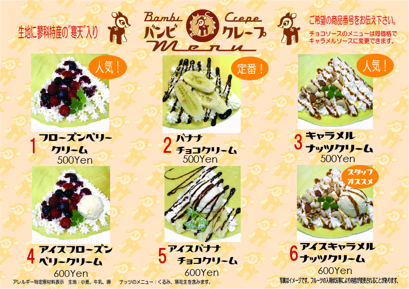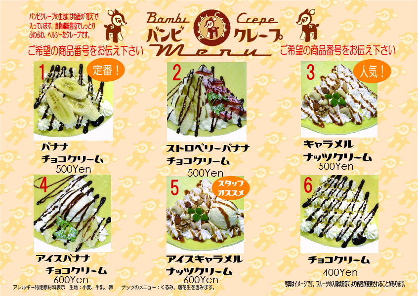 - 混乱を避ける為にも、クレープ交換券等をお作りいただき、その券1枚につきクレープ1つ等とお客様にもご説明いただけるとスムーズです。